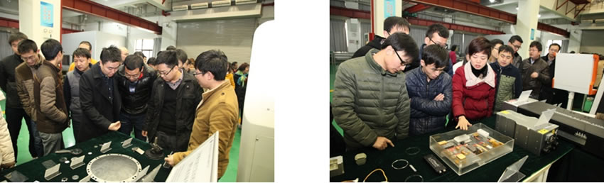 科技创新成果展设在检测大厅,展区分为两部分,第一部分展出我所近年坚持面向国际前沿、面向国家需求的同时,面向经济发展主战场,在高端装备制造产业领域、下一代光电子集成芯片产业领域和民生健康产业领域成功转移转化的多项创新成果。包括超快激光高端加工装备、1000W光纤激光切割装备、高性能碳纤维、光子集成芯片、Hi-Fi音乐手机时钟芯片、压力传感器芯片、红外投影血管成像仪、3D内窥式OCT、3D云投射及3D教学投影系统等多项产品。第二部分展出研究所“十一五”以来圆满完成国家重大任务所取得的十多项重要成果。